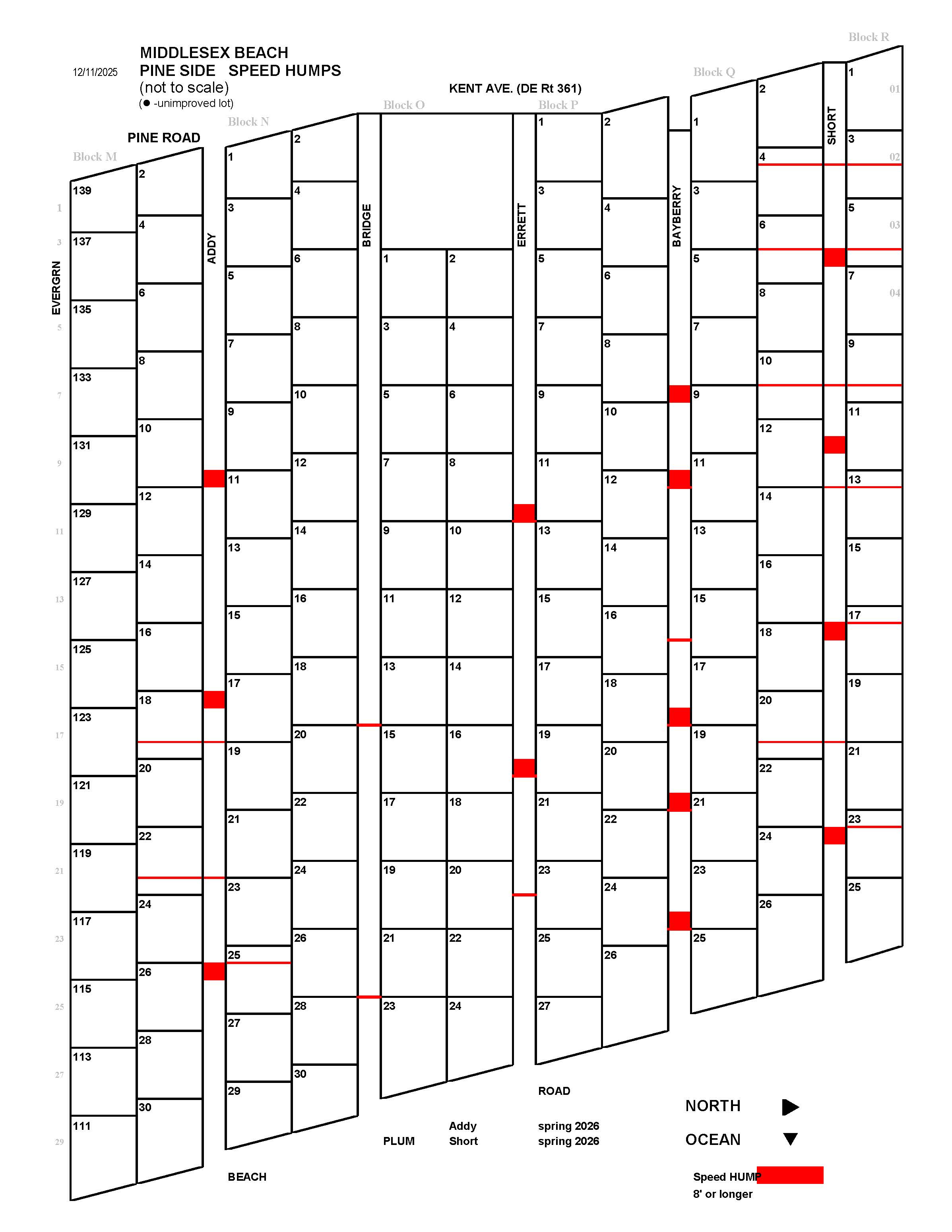 Community Facilities Committee Proposed changes to speed bumps/humps along Short Rd Note: while the Board has developed a plan that calls for roughly evenly sized and spaced speed humps on each pineside road, these modifications for the most part will be done as the roads are paved. Our contractor has advised us that when paving an entire street, they prefer to remove any existing speed devices first, pave the road, THEN install speed humps. We currently plan to repave Addy Rd in the spring of 2026, and will modify the speed humps on that road at that time. Our current long-term plan is to repave a pineside road every other year, but the exact order has not yet been determined and the plan may be accelerated. Because of complaints about the layout of the speed bumps and humps along Short Rd, the Board has agreed on a plan to install 4 evenly sized and spaced speed humps on this road in the spring of 2026 (finishing in 2034), and remove what's currently in place (speed humps that line up with an existing bump would be used as the base for the new hump). It should be noted that Short Rd would still be on the list for paving in the future, and speed humps would be redone at that time. |